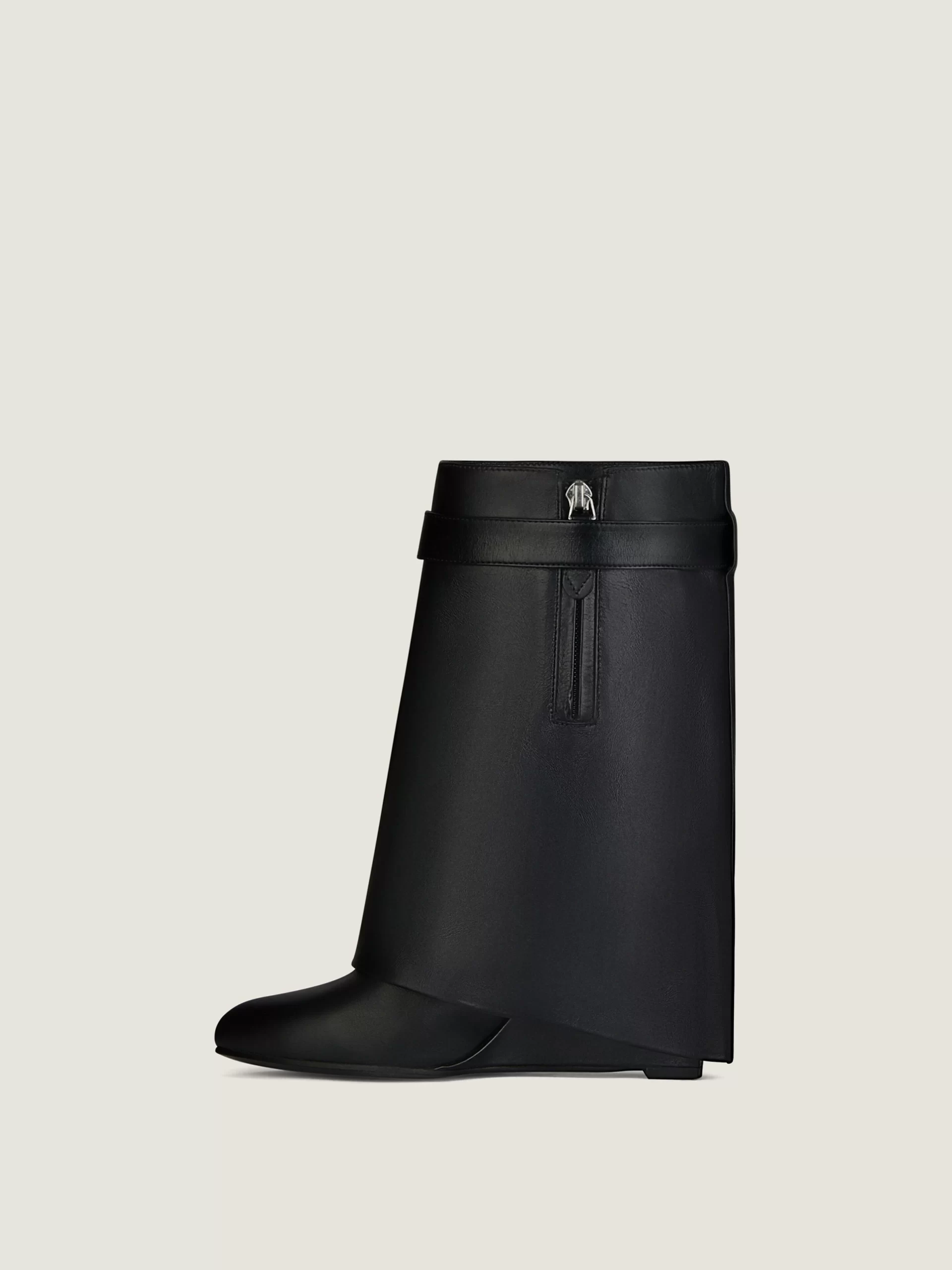 - Hidden zipper with leather zipper pull on the inside of the foot.